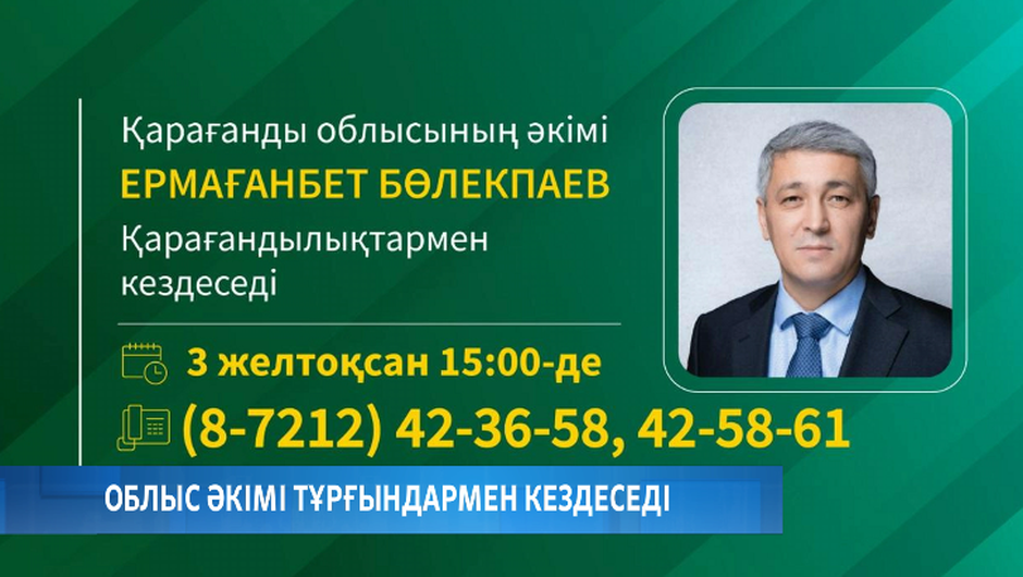 Облыс әкімі тұрғындармен кездеседі 02.12.2025 14:10 Қарағанды облысының әкімі Ермағанбет Бөлекпаев Қарағанды қаласы тұрғындарымен кездесу өткізеді. Сұрақтар мен ұсыныстар жинау үшін жұмыс тобы құрылған.