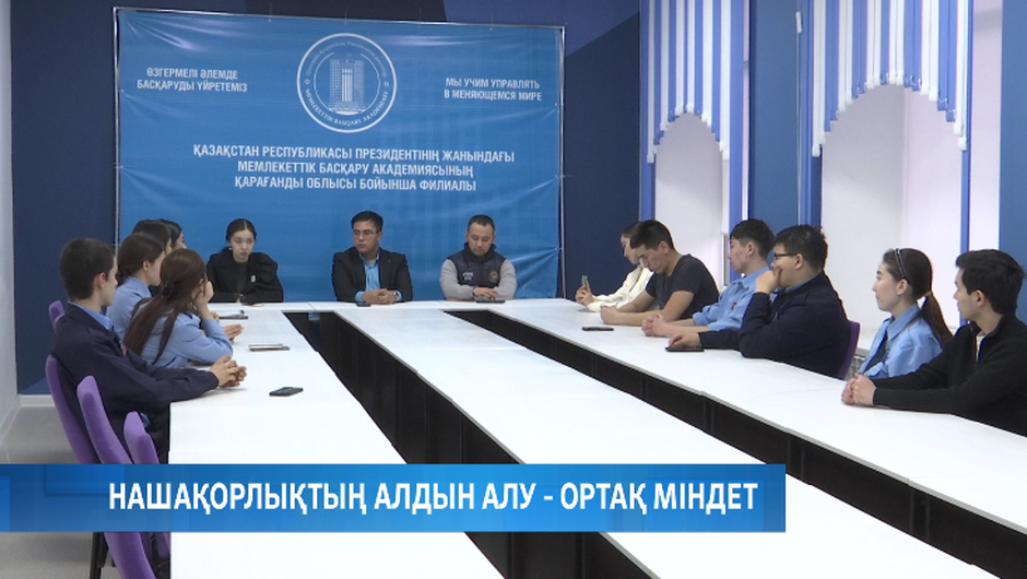 Қарағанды облысындағы Мемлекеттік басқару академиясының филиалында, өңірдің белсенді жастары полиция қызметкерлерімен кездесті. Жиында жастардың қоғамдағы рөлі, құқық бұзушылықтың алдын алу мәселелері, соның ішінде «есірткі тасымалдаушылардың» әрекеті мен қылмыстары талқыланды.