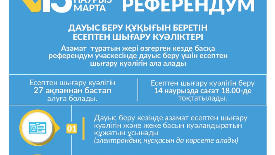 Қазақстандағы референдумда дауыс беру кезінде азаматтар тіркеу орны бойынша емес, өзіне ыңғайлы кез келген сайлау учаскесінде дауыс беруге мүмкіндік беретін ресми құжат – есептен шығару куәлігін пайдалана алады. 2026 жылғы 15 наурызға белгіленген жаңа Конституция жобасы бойынша республикалық референдумға байланысты есептен шығару куәліктерін алу тәртібі төмендегідей: