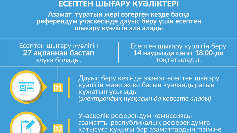 Бір елді мекен шегіндегі басқа учаскеде дауыс бергісі келетін азаматтарға есептен шығару куәлігі берілмейтініне назар аударыңыз.